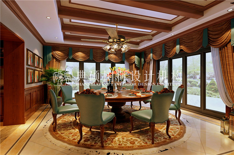美式风格的餐厅以实木的餐桌配上带软包的餐椅使生活更具有舒适感,同时软装颇为丰富,显示主人独有的生活经历,表现自己对生活的认识。