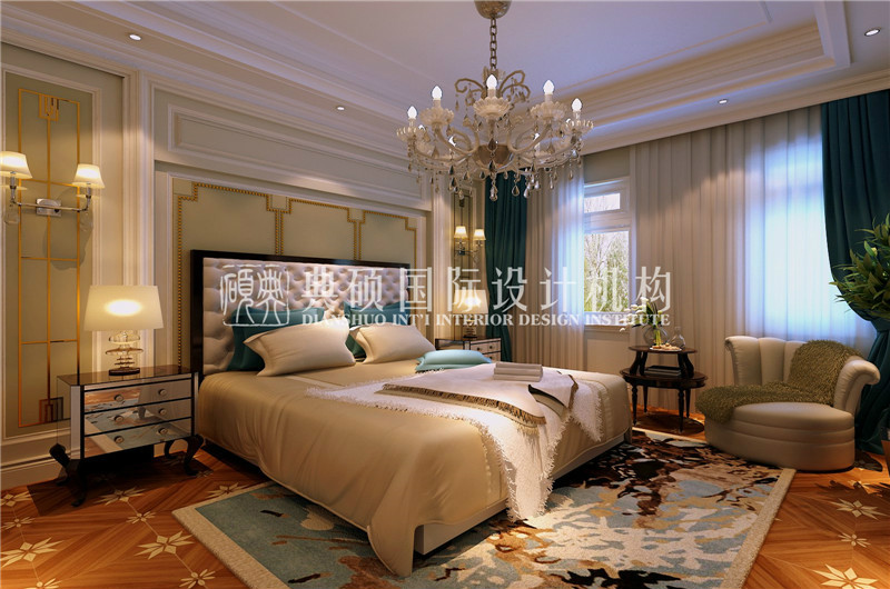 美式风格设计理念中的卧室,通常是以功能性和实用舒适度为主要设计理念。在卧室内,通常使用装饰吊灯,采用非炫目式灯光,显得温馨舒适。在饰品布置上,大多都是用成套的布艺来装饰房间。