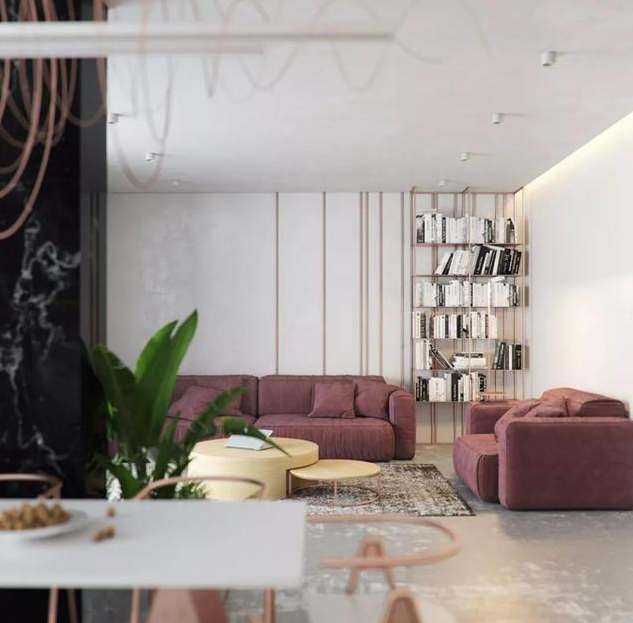 粉红灰色别墅设计,不经意间表现出一种诙谐的幽默感,丰富的装饰与雕塑,柔和的色彩,点缀的曲面与艺术空间,展现了别墅空间的典雅浪漫。客厅作为空间的主要居住区域,肩负着迎接客人和生活的重要任务,先进的灰调给空间以一种安静、舒适的感觉,粉红增添了女性的温柔气质,在这两种色调的对比下,整个客厅显得格外柔和典雅。复古格子地,使该地区成为一个单独的,已变得非常分层。淡灰色的沙发,柔软的线条,粉红色的枕头,显示出温柔和舒适。绿化背景墙为空间增添了生命的魅力。沙发对面的墙壁被镜像,这样空间就有了延伸和拉长的效果。