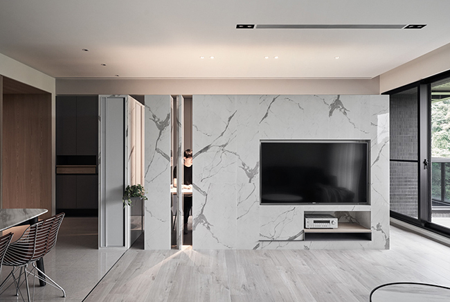客厅保持一层空间白色和对数色调,突出线条干净。设计师在最大限度地引入自然光的同时扩大客厅,以提供充足的光线。电视采用嵌入式,下面的橱柜不仅隐藏了插座线的一部分,还满足了业主的接收需求。
