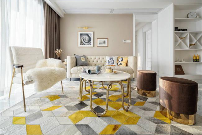 欧式客厅装饰很精致,整体色调主要是土金,给人以光彩和平静的感觉。墙面设计元素采用天然纹理大理石,天花板拼贴花纹设计搭配花纹地毯,展现古典奢华感。而精致柔软的衣裙搭配在起居室中,表现出轻柔的特点,使别墅客厅具有更加华丽、精致的高端气质。
